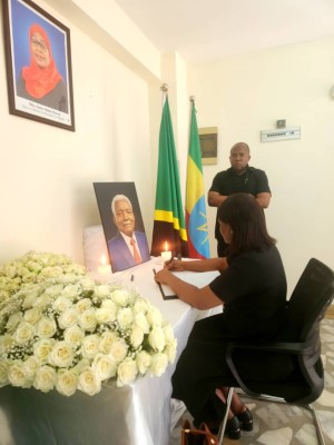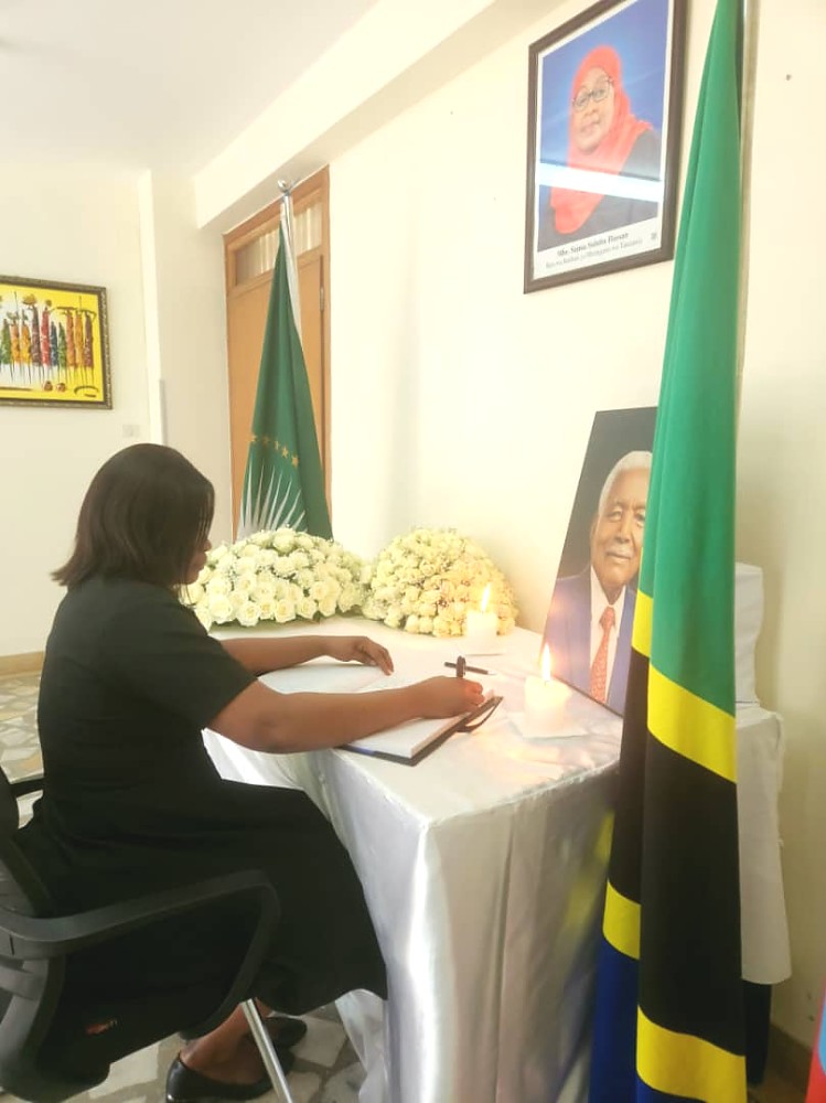 Bi. Patricia Yeboah, Mwakilishi wa Balozi wa Ghana nchini Ethiopia akisaini kitabu cha maombolezo kufuatia kifo cha Alhaj Ali Hassan Mwinyi, aliyekuwa Rais wa awamu ya Pili wa Jamhuri ya Muungano wa Tanzania.
