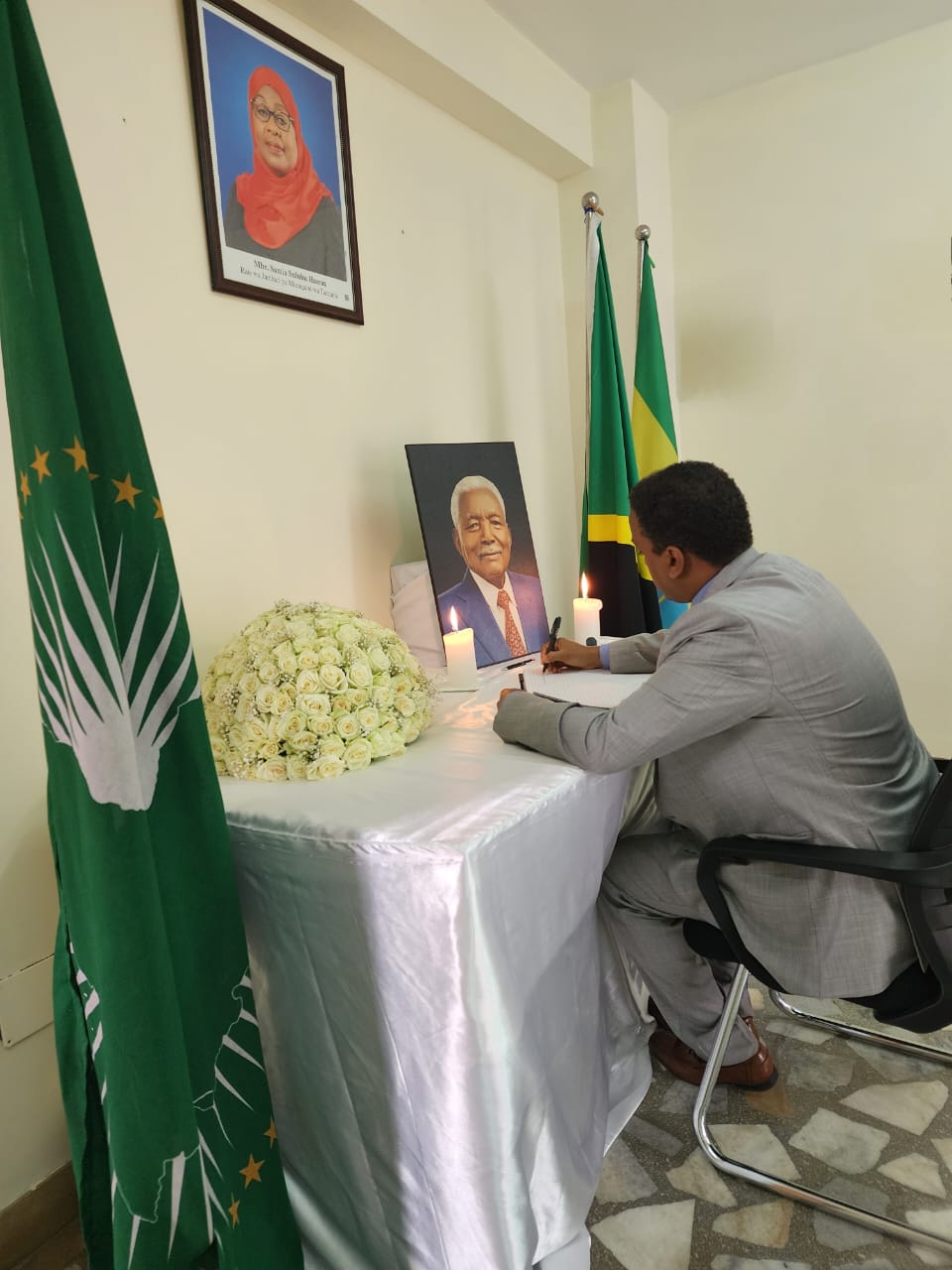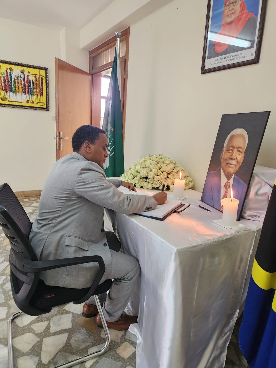 Bw. Biniam Berhe, Kaimu Balozi wa Eritrea nchini Ethiopia akisaini kitabu cha maombolezo kufuatia kifo cha Alhaj Ali Hassan Mwinyi, aliyekuwa Rais wa awamu ya Pili wa Jamhuri ya Muungano wa Tanzania.