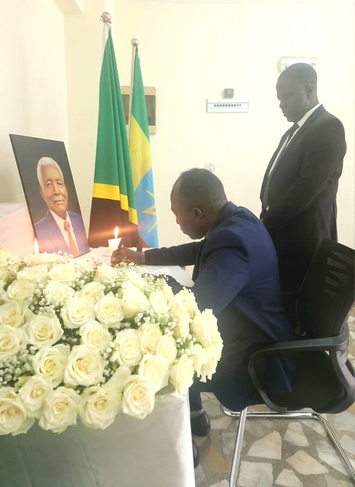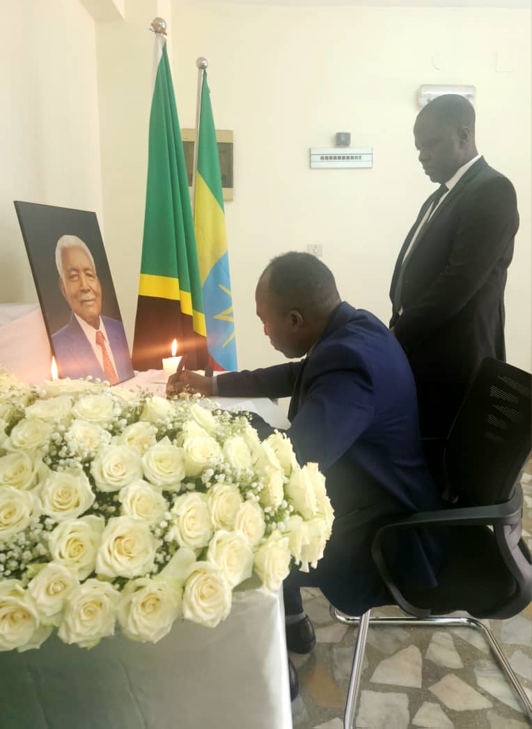 Bw. Karim Ouepia Idogo, Kaimu Balozi wa Burkina Faso nchini Ethiopia akisaini kitabu cha maombolezo kufuatia kifo cha Alhaj Ali Hassan Mwinyi, aliyekuwa Rais wa awamu ya Pili wa Jamhuri ya Muungano wa Tanzania.