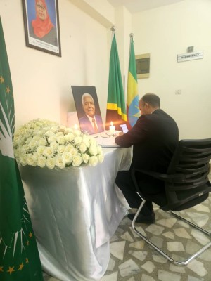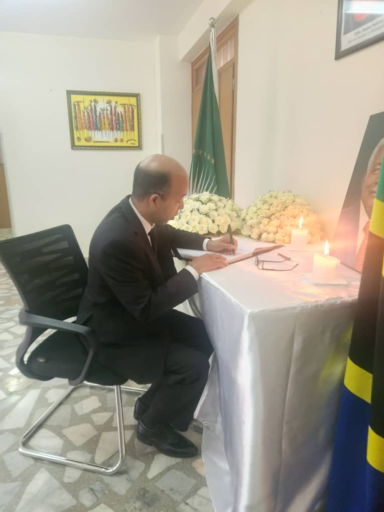 Bw. Mohamdy Amme, Mwakilishi wa Balozi wa Mauritania nchini Ethiopia akisaini kitabu cha maombolezo kufuatia kifo cha Alhaj Ali Hassan Mwinyi, aliyekuwa Rais wa awamu ya Pili wa Jamhuri ya Muungano wa Tanzania.