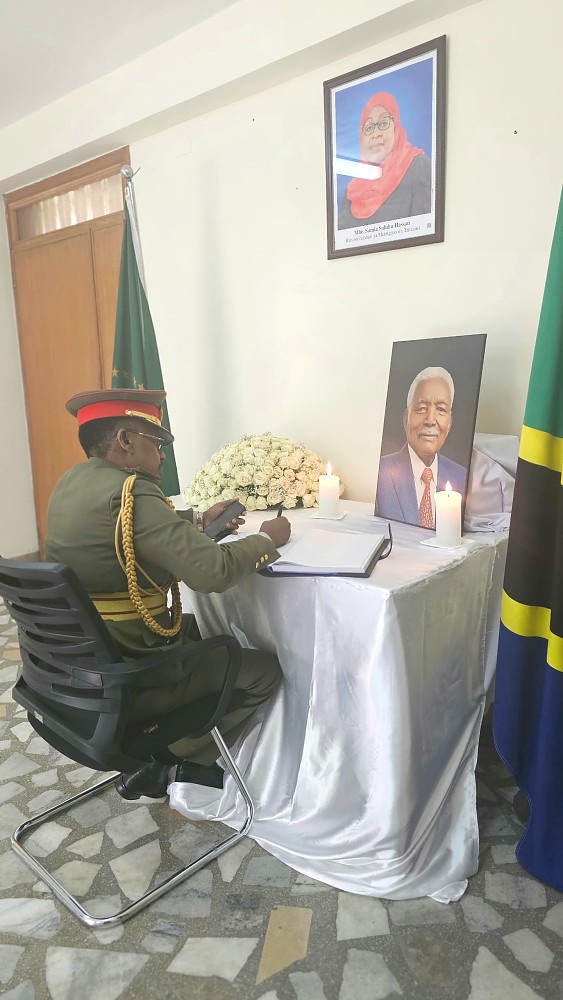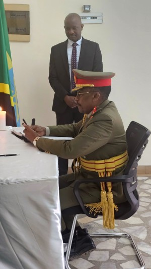 Col. Fred Zakye, Mwambata Jeshi wa Uganda nchini Ethiopia akisaini kitabu cha maombolezo kufuatia kifo cha Alhaj Ali Hassan Mwinyi, aliyekuwa Rais wa awamu ya Pili wa Jamhuri ya Muungano wa Tanzania.