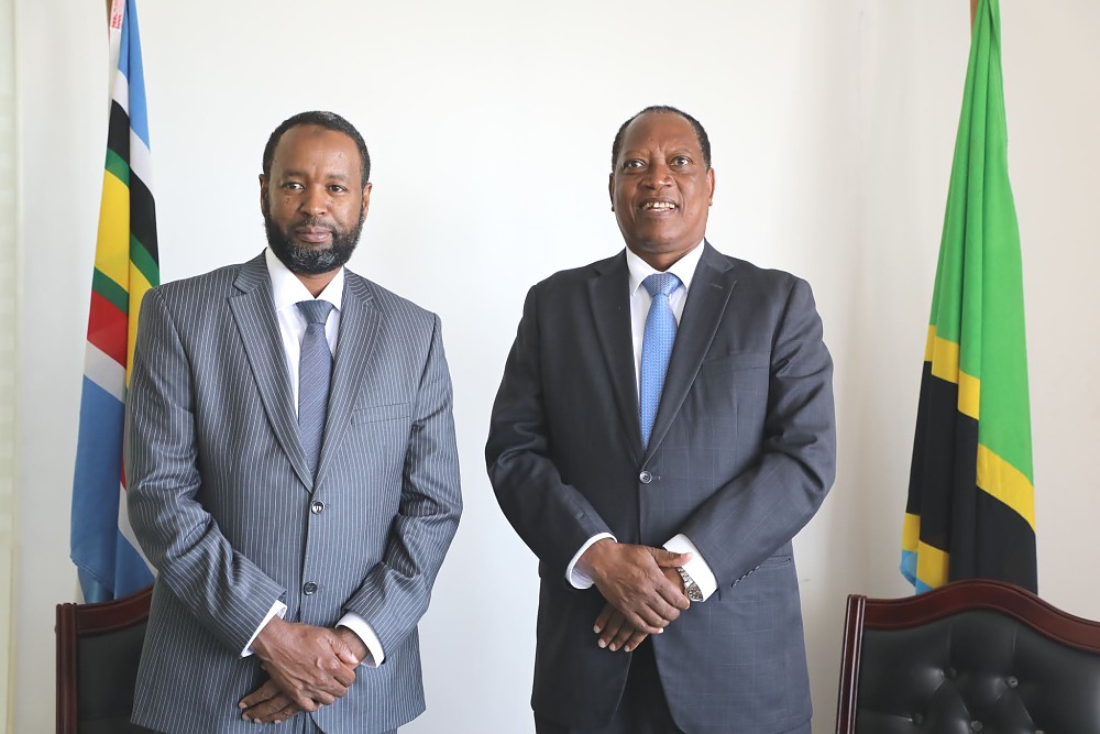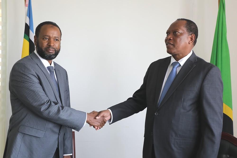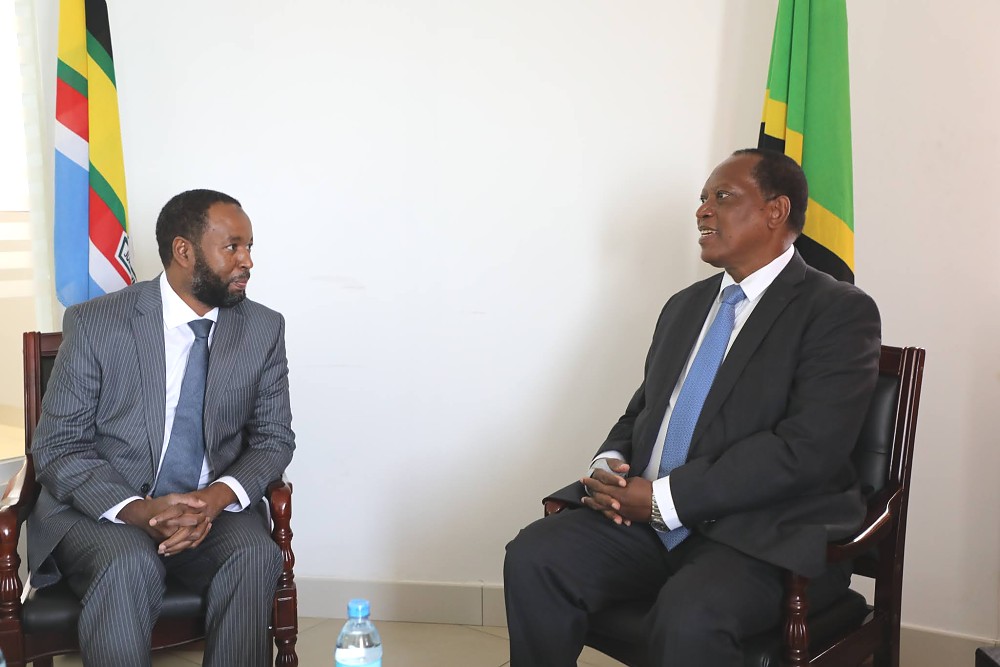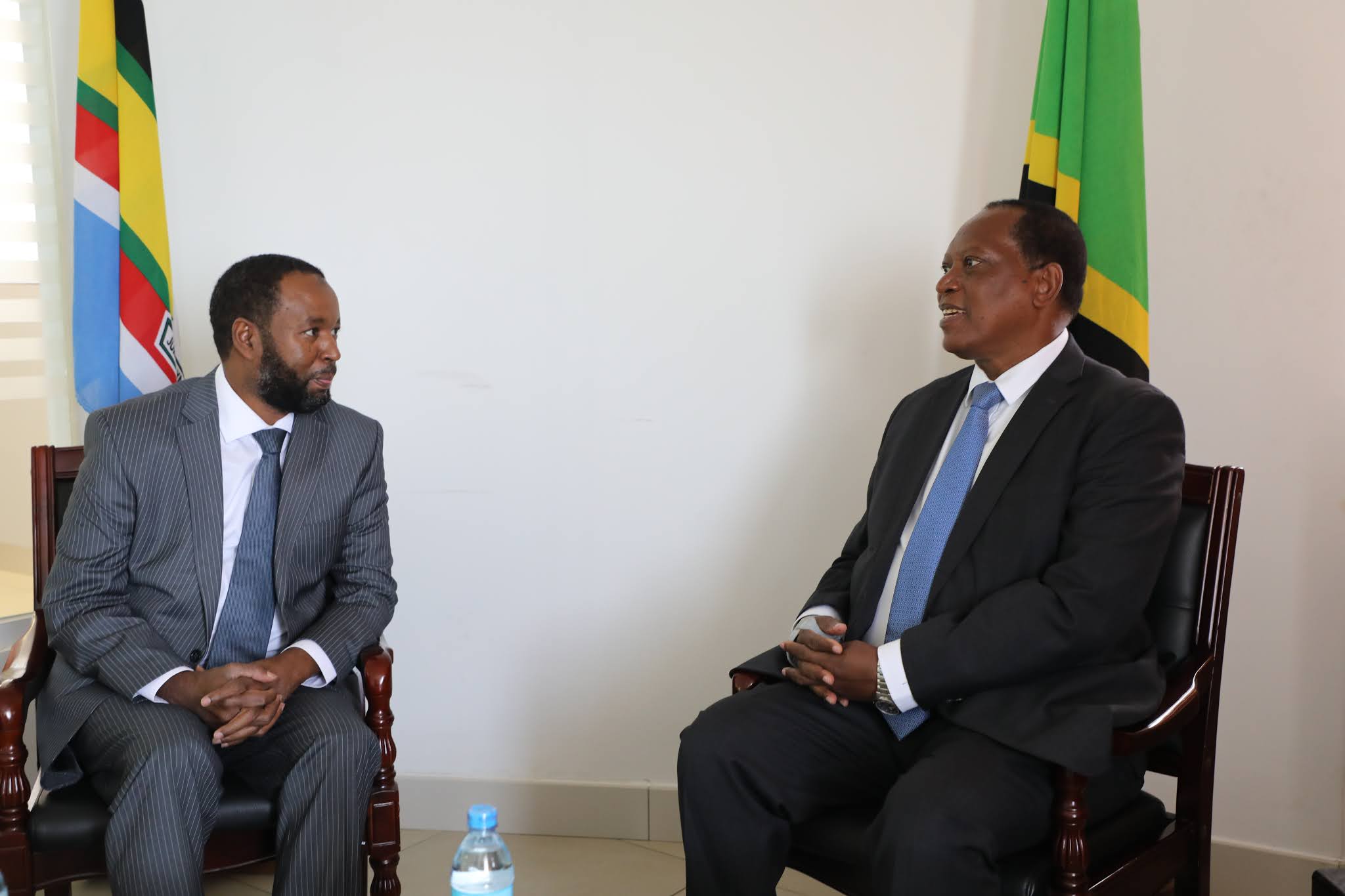 Waziri wa Mambo ya Nje na Ushirikiano wa Afrika Mashariki Mhe. Prof. Palamagamba John Kabudi akiwa na Bw. Mohammed Abdiker Mohamud Mkurugenzi wa Shirika la Kimataifa la Uhamaji (IOM) Kanda ya Afrika Mashariki na Pembe ya Afrika walipokutana kwa mazungumzo ofisini kwake jijini Dodoma.