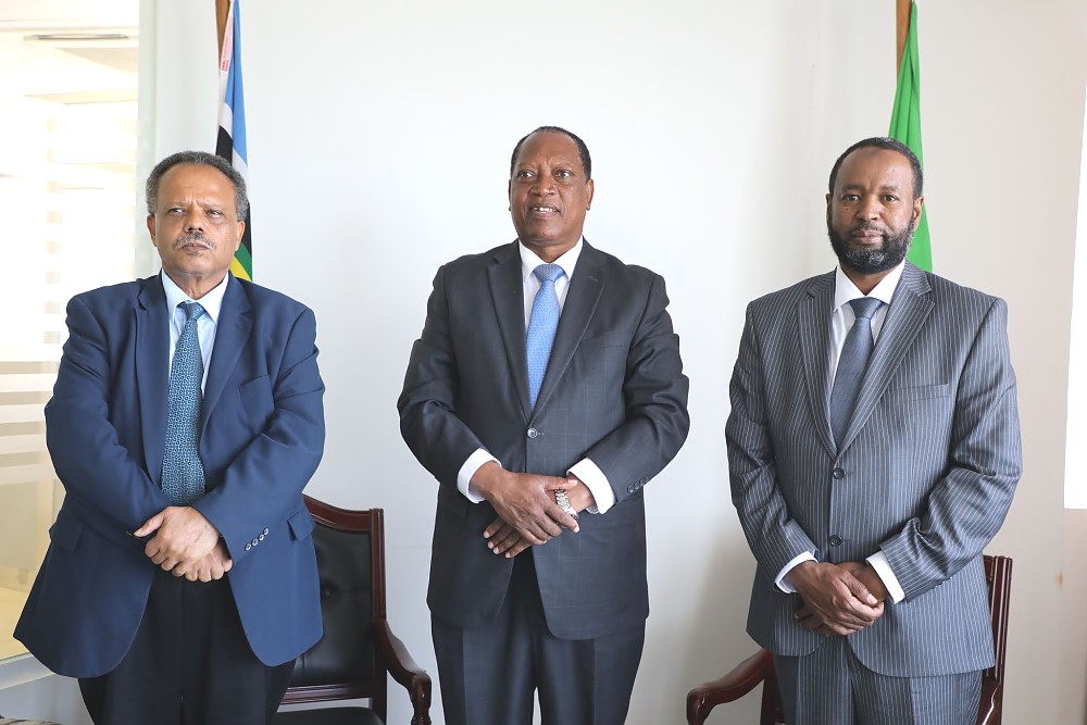Mambo ya Nje na Ushirikiano wa Afrika Mashariki Mhe. Prof. Palamagamba John Kabudi, Bw. Mohammed Abdiker Mohamud Mkurugenzi wa Shirika la Kimataifa la Uhamaji (IOM) Kanda ya Afrika Mashariki na Pembe ya Afrika (kulia) na Bw.Qasim Sufi Mkurugenzi Mkaazi wa IOM nchini (kushoto) katika picha ya pamoja baada ya kumaliza mazungumzo yao yaliyofanyika jijini Dodoma.