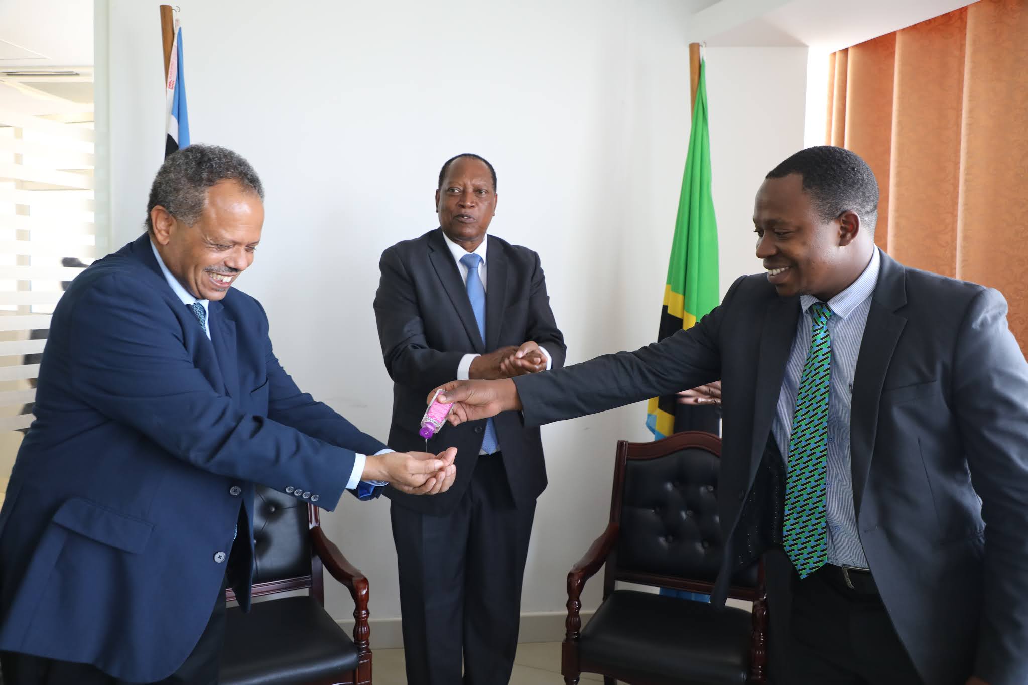 Waziri wa Mambo ya Nje na Ushirikiano wa Afrika Mashariki Mhe. Prof. Palamagamba John Kabudi na Bw.Qasim Sufi Mkurugenzi Mkaazi wa IOM nchini wakitakasa mikono baada ya kumaliza mazungumzo yao yaliyofanyika jijini Dodoma.