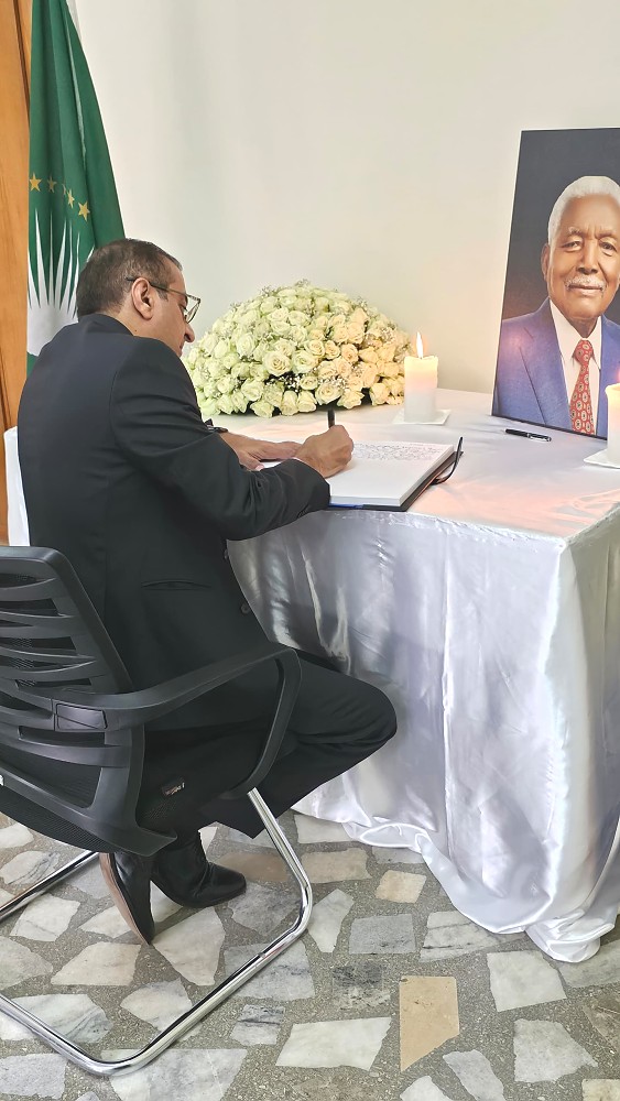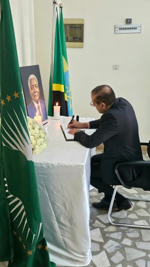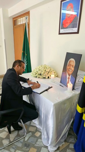 Mhe. Atif Sharif Mian Balozi wa Pakistan nchini Ethiopia akisaini kitabu cha maombolezo kufuatia kifo cha Alhaj Ali Hassan Mwinyi, aliyekuwa Rais wa awamu ya Pili wa Jamhuri ya Muungano wa Tanzania.