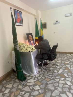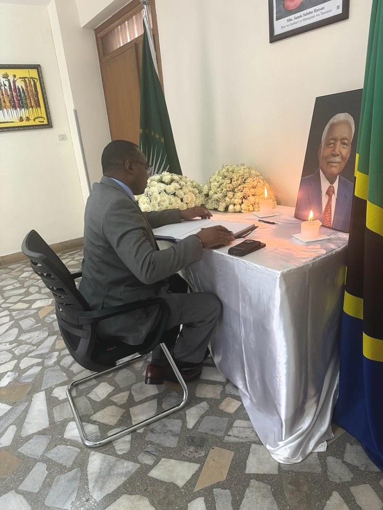 Mhe. George Morara Orina, Balozi wa Kenya nchini Ethiopia akisaini kitabu cha maombolezo kufuatia kifo cha Alhaj Ali Hassan Mwinyi, aliyekuwa Rais wa awamu ya Pili wa Jamhuri ya Muungano wa Tanzania.