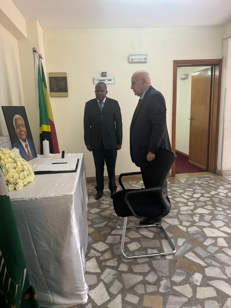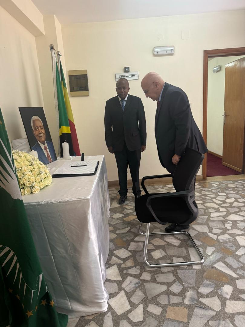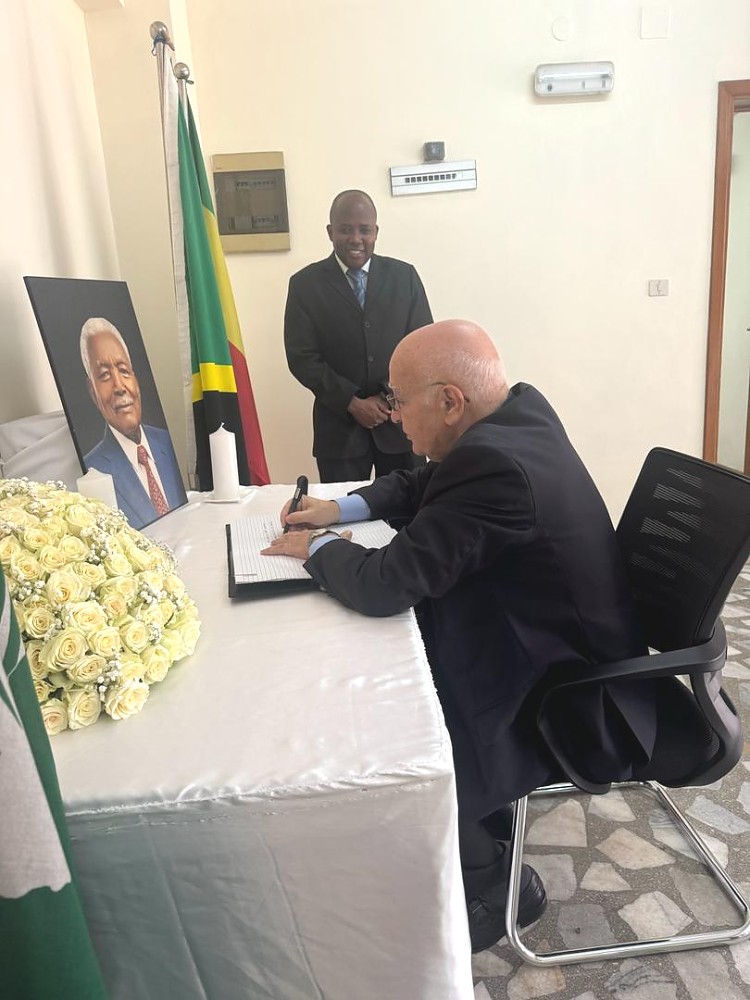 Mhe. Mohamed Lamine Laabas, Balozi wa Algeria nchini Ethiopia akisaini kitabu cha maombolezo kufuatia kifo cha Alhaj Ali Hassan Mwinyi, aliyekuwa Rais wa awamu ya Pili wa Jamhuri ya Muungano wa Tanzania.