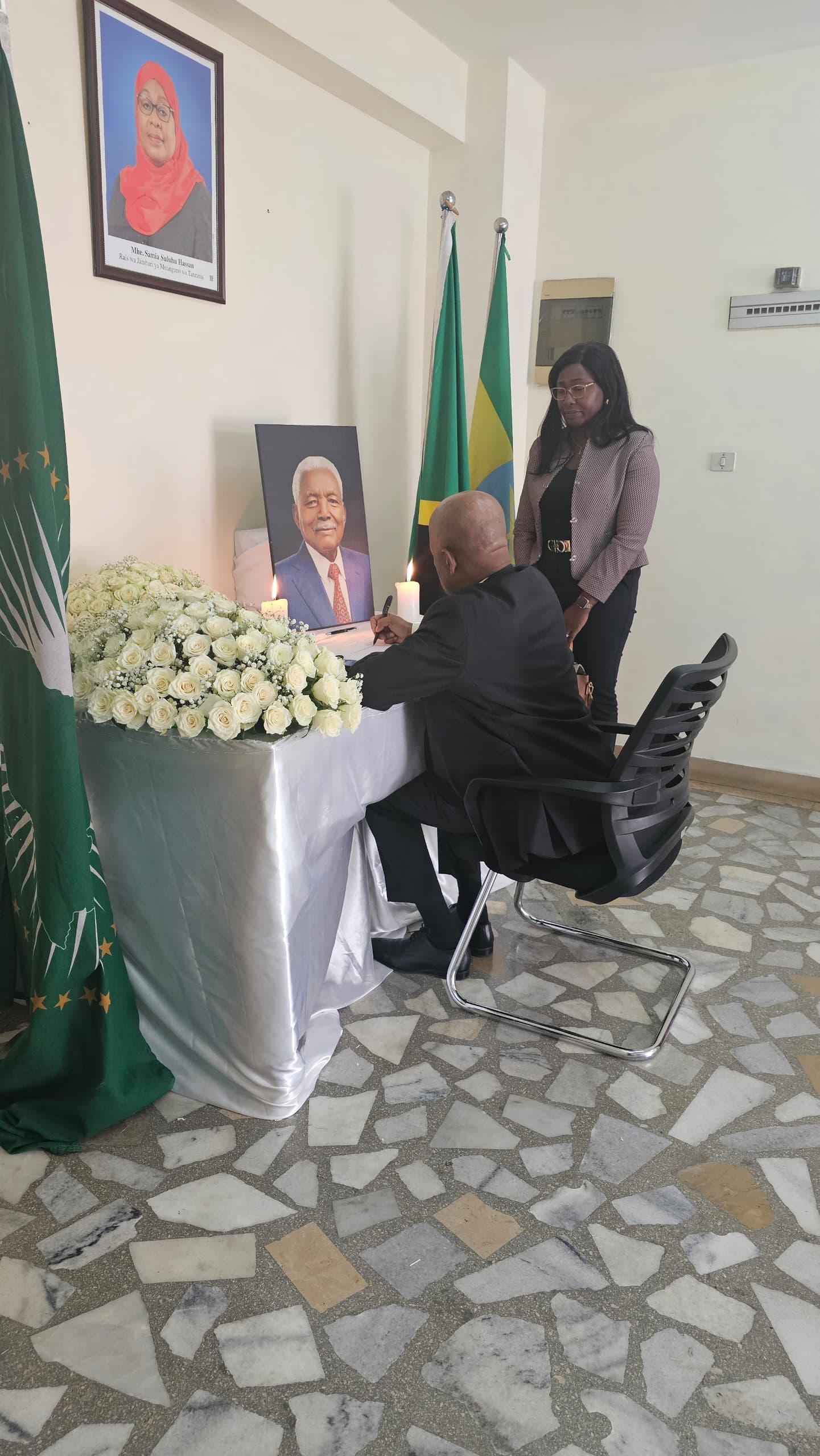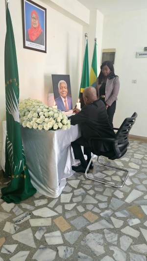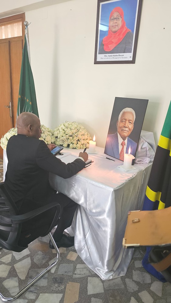 Mhe. Nasir Amimu Balozi wa Nigeria nchini Ethiopia akisaini kitabu cha maombolezo kufuatia kifo cha Alhaj Ali Hassan Mwinyi, aliyekuwa Rais wa awamu ya Pili wa Jamhuri ya Muungano wa Tanzania.