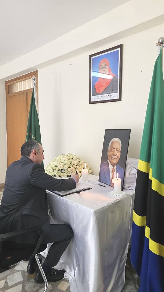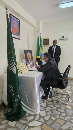 Mhe. Sahak Sargsyan Balozi wa Armenia nchini Ethiopia akisaini kitabu cha maombolezo kufuatia kifo cha Alhaj Ali Hassan Mwinyi, aliyekuwa Rais wa awamu ya Pili wa Jamhuri ya Muungano wa Tanzania.