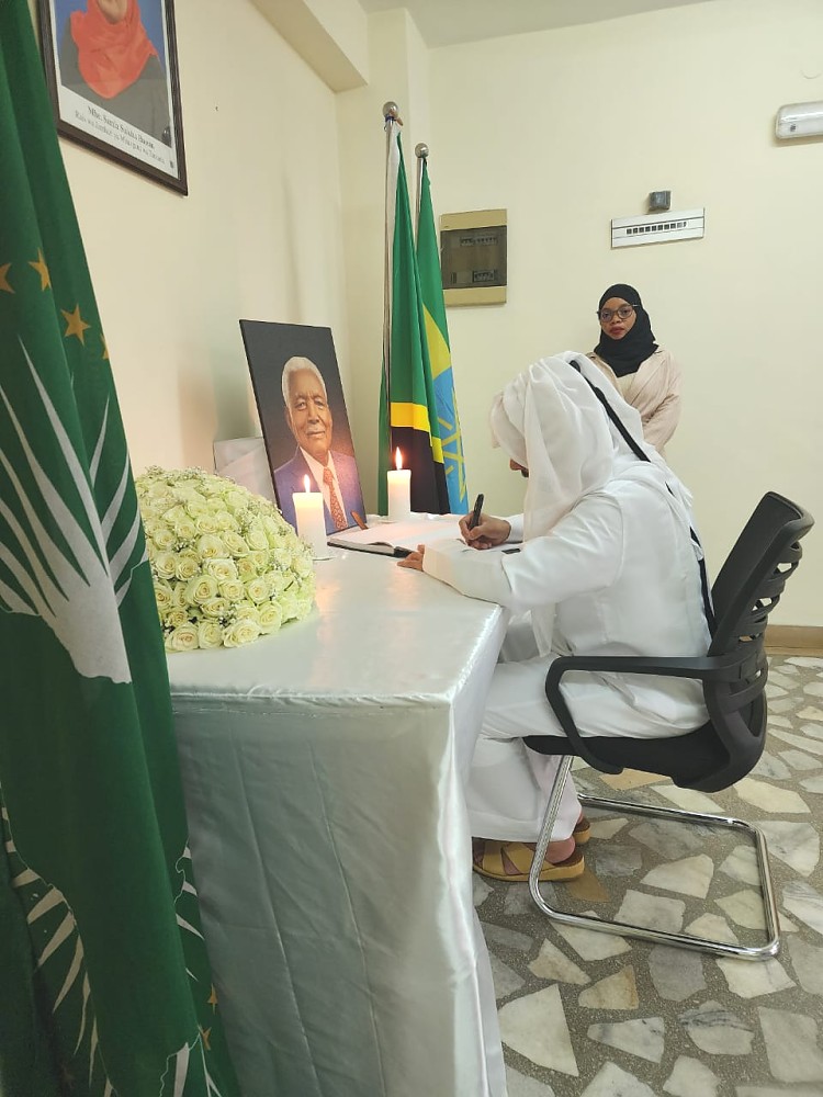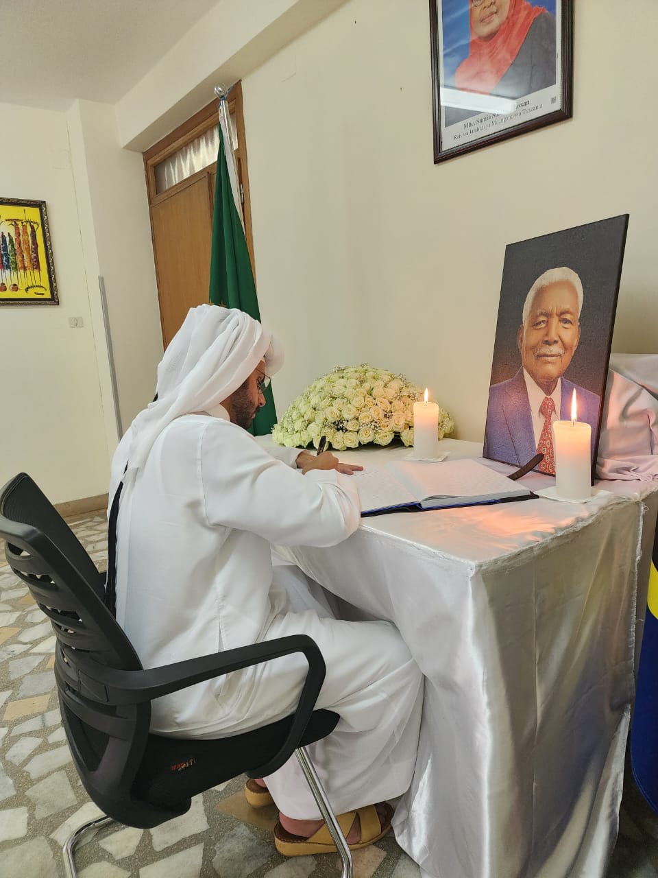 Mr. Jaber Al-Hajri, Kaimu Balozi, Ubalozi wa Qatar nchini Ethiopia akisaini kitabu cha maombolezo kufuatia kifo cha Alhaj Ali Hassan Mwinyi, aliyekuwa Rais wa awamu ya Pili wa Jamhuri ya Muungano wa Tanzania.