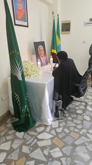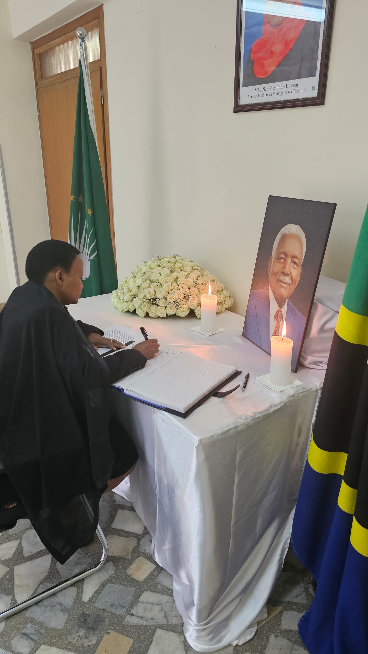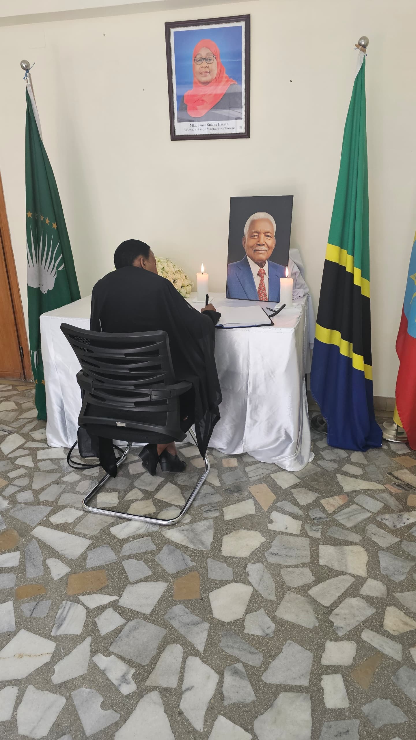 Mrs. Doreen Mutemba, Kaimu Balozo, Ubalozi wa Zimbabwe nchini Ethiopia akisaini kitabu cha maombolezo kufuatia kifo cha Alhaj Ali Hassan Mwinyi, aliyekuwa Rais wa awamu ya Pili wa Jamhuri ya Muungano wa Tanzania.