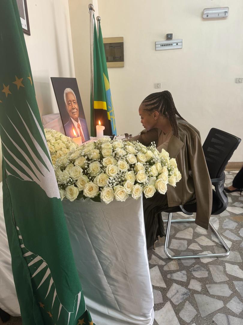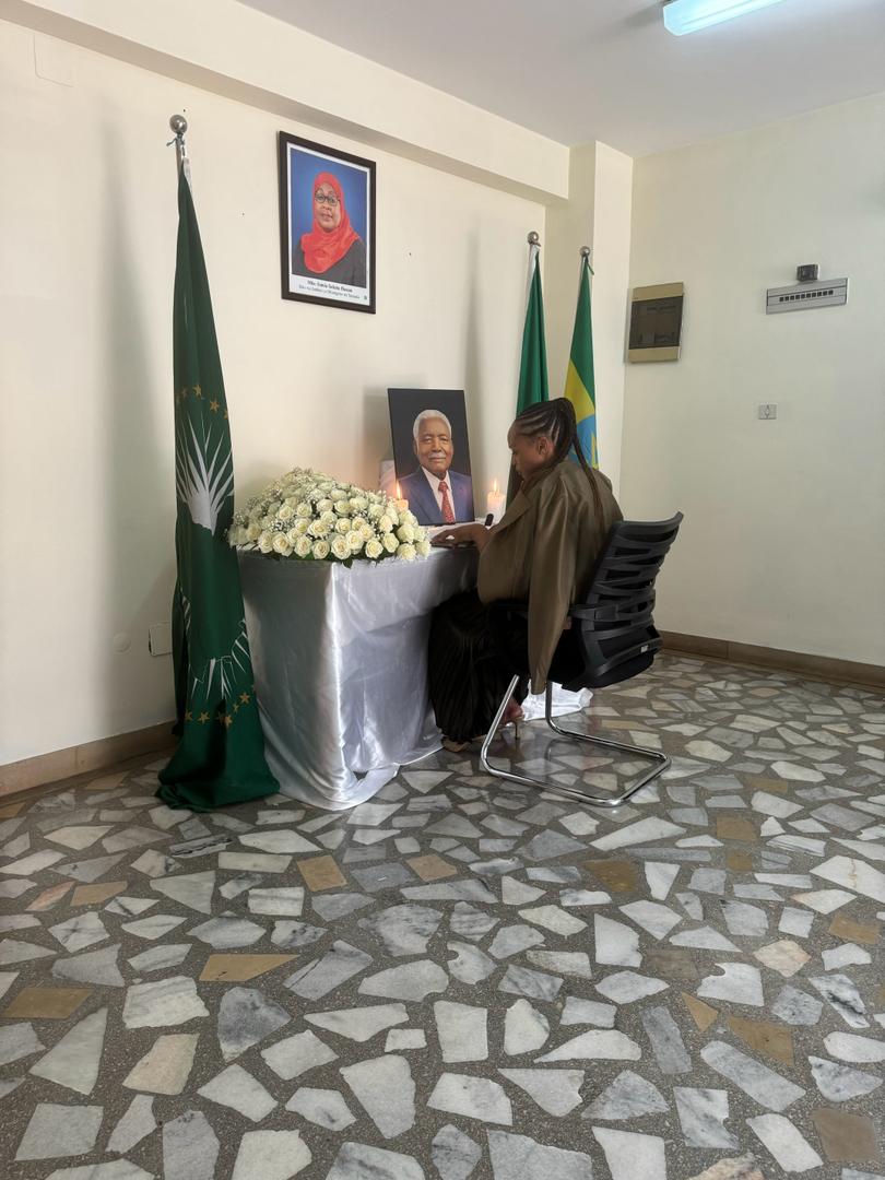 Mrs. Matheko Ursula Latsie, Kaimu Balozi, Ubalozi wa Afrika Kusini nchini Ethiopia akisaini kitabu cha maombolezo kufuatia kifo cha Alhaj Ali Hassan Mwinyi, aliyekuwa Rais wa awamu ya Pili wa Jamhuri ya Muungano wa Tanzania.