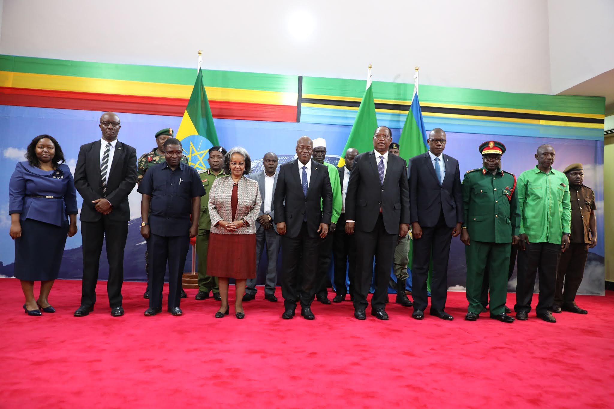 Mheshimiwa Dkt. John Pombe Joseph Magufuli Rais wa Jamhuri ya Muungano wa Tanzania na Mheshimiwa Sahle-Work Zewde Rais wa Jamhuri ya Kidemokrasia ya Shirikisho la Ethiopia wakiwa katika picha ya pamoja na baadhi ya Watendaji wa Serikali ya Tanzania na Ethiopia
