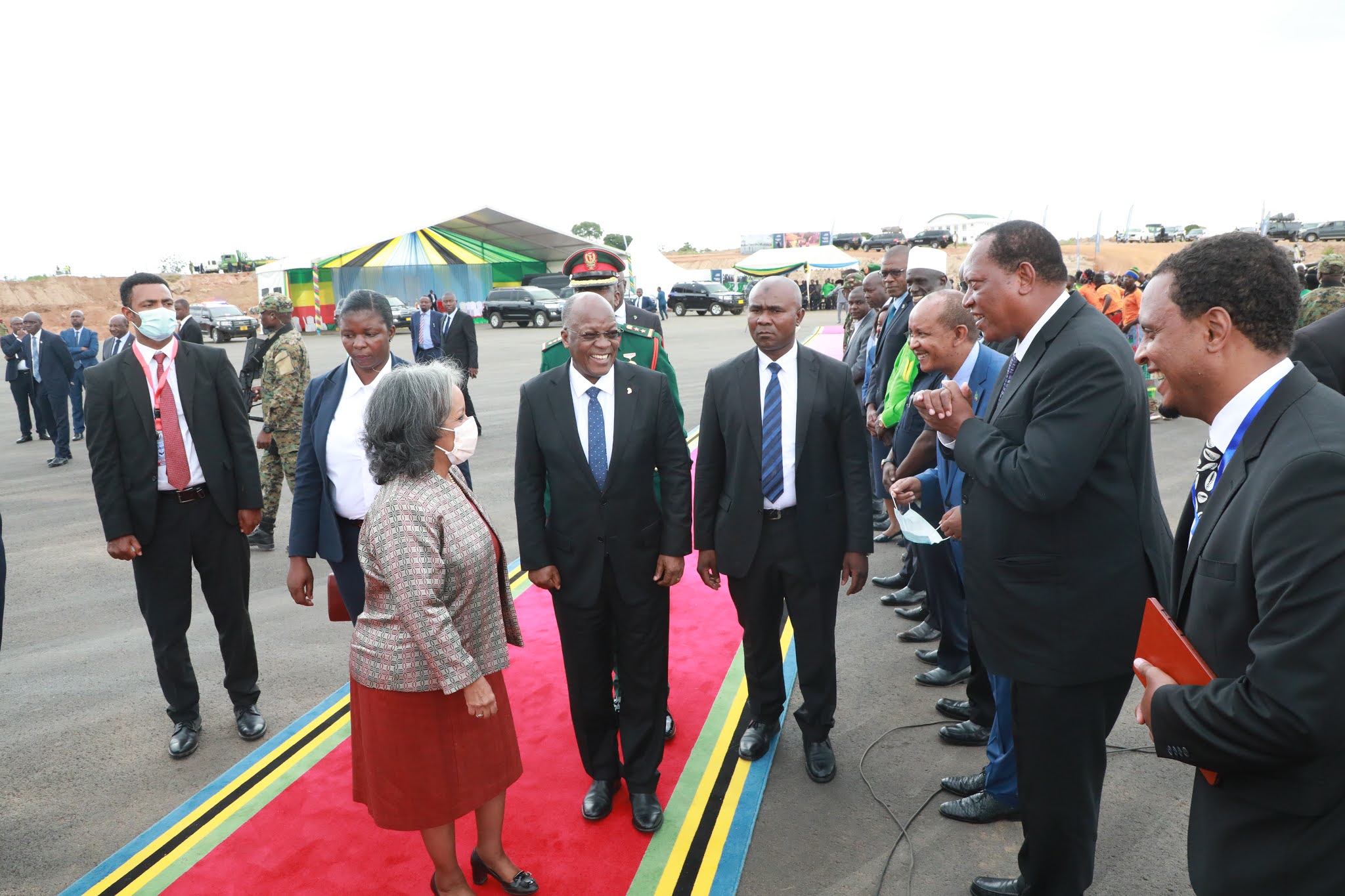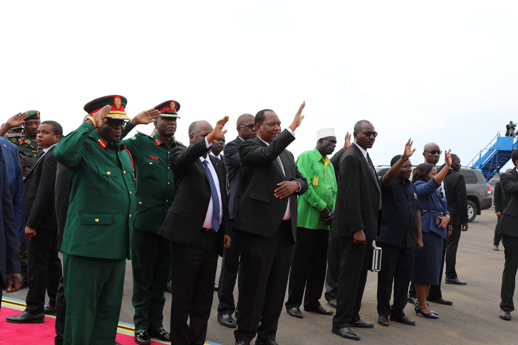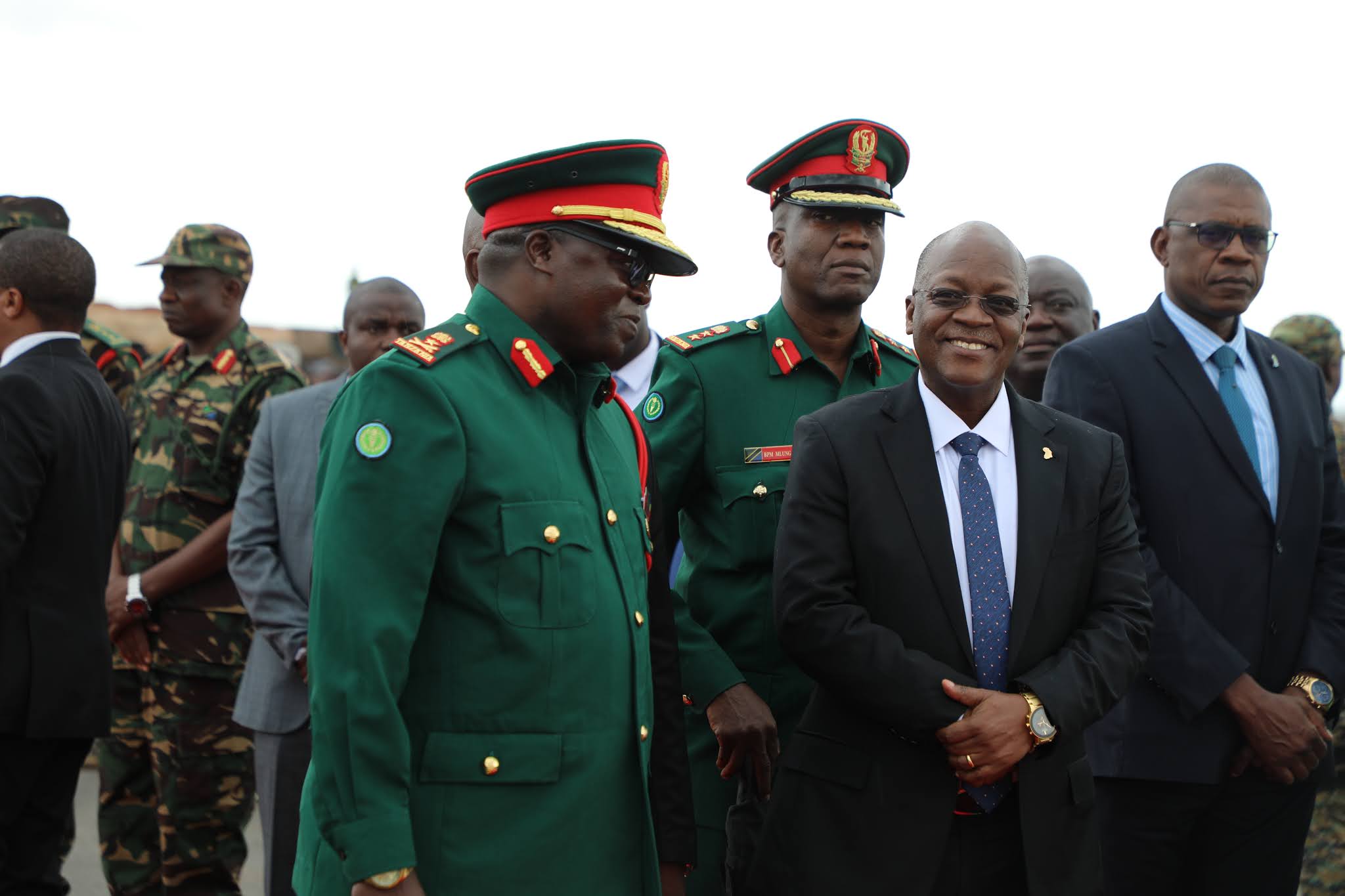 Mheshimiwa Dkt. John Pombe Joseph Magufuli, Rais wa Jamhuri ya Muungano wa Tanzania na Balozi Brigedia Jenerali Wilbert Ibuge, Katibu Mkuu Wizara ya Mambo ya Nje na Ushirikiano wa Afrika Mashariki wakifurahia jambo wakati wa kumhaga Rais Zewde baada ya kuhitimisha ziara yake ya kikazi nchini.
